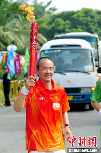 10月18日,第16届亚运火炬在深圳站传递。图为联合国环境署“Live com人居卓越贡献奖”王石在进行火炬传递。 中新社发 陈文 摄