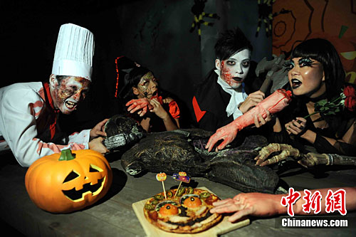 10月18日,一群悉心打扮的“猛鬼”热情款待宾客光临。香港apm商场为了刺激消费,特别在万圣节期间装饰成“好玩鬼酒店”,供市民参观拍照。中新社发 谭达明 摄
