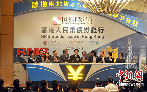 10月18日,国家开发银行在香港举行人民币债券发行仪式,宣布将于2010年10月19日至11月5日,第三次在香港公开发行人民币固息债券。图为国家开发银行副行长高坚(中)、特区财政司司长曾俊华(左五)、中联办副主任王志民(右五)等主礼嘉宾启动发行仪式。中新社发 邓庆乐 摄