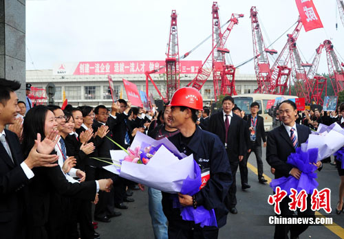 19日,经过20多天的日夜坚守,参与智利矿难救援的中国三一集团工程师郝恒(中)回到中国上海,并受到公司同事的热烈欢迎。中国工程机械设备与中国技术人员积极参与智利矿难救援,受到了智利政府和人民的肯定和感谢。智利政府在感谢信中这样写道:“中国制造的机械设备为此次救援行动提供了保障,中方有关企业还派员专程赴智利进行协助。感谢中国三一对智利救援所做的贡献,感谢三一工程师郝恒在救援现场的日夜坚守。”