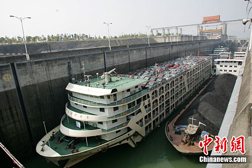 图为19日上午三峡五级船闸闸室内停满了客货船。刘良伟 摄