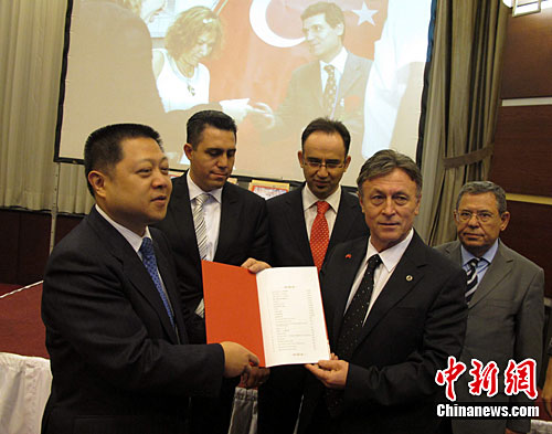 当地时间18日,中国国务院新闻办分别向安卡拉大学、中东技术大学、佳蕾学校、土耳其国际战略研究组织赠送1000多册中国图书。图为中国国新办副主任王仲伟(左)向安卡拉大学东语系汉学组主任欧凯教授赠送图书。李鹏 摄