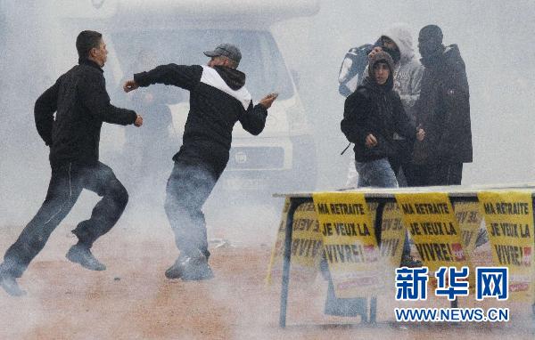 10月19日,在法国里昂的反对退休制度改革罢工中,青年人向防爆警察投掷石块。