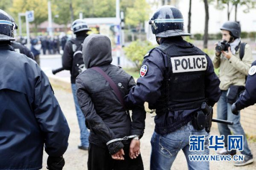 10月19日,在法国巴黎的反对退休制度改革罢工中,警察逮捕一名青年。