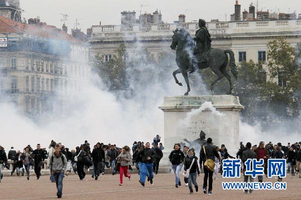10月19日,青年人在法国里昂参加反对退休制度改革罢工。