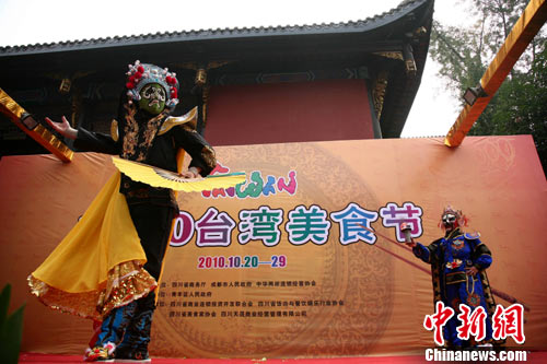 10月21日,成都举办台湾美食节,包括基隆蟹黄虾球、台北冰糖葫芦、大肠包小肠等100多种台湾名小吃从宝岛远渡台湾海峡来到天府之国四川成都。据了解,美食节的举办是中共四川省委书记刘奇葆今年五月访台时提议,并得到了国民党吴主席的赞同,这既是“天府四川宝岛行”活动的深化,也是川台合作的又一成果。图为四川绝活川剧变脸在美食节开幕式上表演。