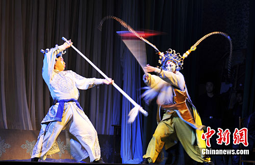 10月18日至22日,甘肃秦剧团到基层为乡下人唱“大戏”,演员们唱念做打演,招招真功夫给乡亲们送来了一场场戏曲大餐。《三滴血》、《火焰驹》、《窦娥冤》等演出,一出出脍炙人口的传统剧目风格各异,精彩纷呈,乡亲们在一次次的情节跌宕中笑声不止、掌声不断。秦腔又称乱弹,源于西秦腔,流行于中国西北的陕西、甘肃、青海、宁夏、新疆等地,又因其以枣木梆子为击节乐器,所以又叫“梆子腔”,俗称“桄桄子”,经国务院批准列入第一批国家级非物质文化遗产名录。中新社发 杨艳敏 摄
