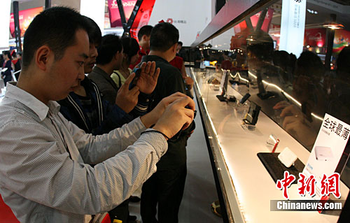 图为体积超薄的电子产品吸引参观者。中新社发 刘忠俊 摄