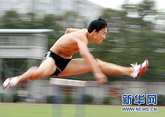 10月22日,刘翔在上海莘庄训练基地赤膊上阵进行训练,全力备战将于11月在广州举行的第十六届亚运会。凡军 摄