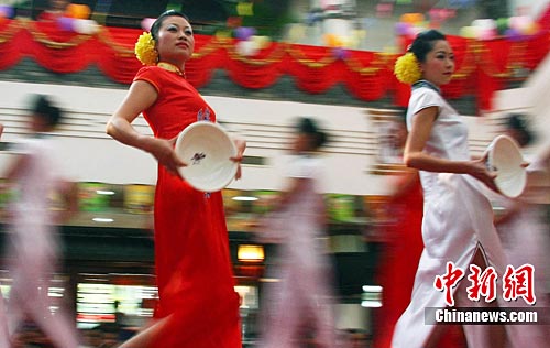 10月22日,作为云南代表美食——过桥米线的发源地,云南蒙自开展了过桥米线特色服装、瓷器展示活动,并评选表彰了“过桥米线”名店。在展示会上,演员穿着中国传统的旗袍服饰,手持装盛过桥米线的瓷碗,向观众展示了具有中国特色的过桥米线餐饮文化。图为演员向观众展示蒙自过桥米线服饰文化。中新社发 任东 摄
