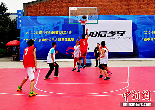 10月23日,2010-2011赛季四川省全民健身篮球公开赛在四川省体育馆正式启动,将有15万人参与到这次四川规模最大的业余篮球联赛中。本次比赛赛程长达10个月,覆盖了全省21个市州的城市、农村、机关、部队、企业、学校和社区。共设置五人篮球和三人篮球两个项目,10个组别。中新社发 安源 摄