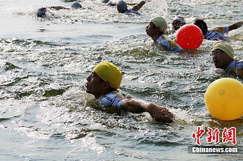 部分水性相对较弱的运动员穿着救生衣下水,或是带着漂浮球参赛。孟幻 摄