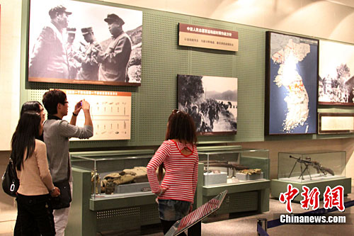 10月24日,几名人士在辽宁省丹东市抗美援朝纪念馆参观。该馆由陈列馆、全景画馆、纪念塔三大建筑组成,总占地面积18万平方米,总建筑面积13790平方米,是中国唯一一座全面反映抗美援朝战争的专题纪念馆。10月25日是中国人民志愿军抗美援朝60周年纪念日。中新社记者 沈殿成 摄