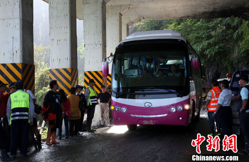 24日,台湾苏花公路部分塌方路段单线抢通。一批游客早已下车逃生的观光巴士已在险处滞留多时,当天得以开始陆续驶出险境。