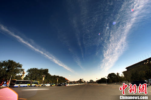10月25日,在经历了一周连绵阴雨低温后,北京放晴,湛蓝的天空白云漂浮一派秋高气爽景象。中新社记者 任晨鸣 摄