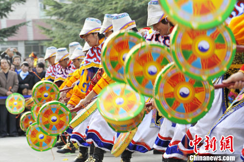 10月下旬,甘肃省非物质文化遗产展览在甘肃省博物馆举行,众多当地民间艺人拿出独门绝技现场展示。图为 “巴郎鼓”舞,这是流行在甘肃省甘南藏族自治州卓尼县境东部藏巴哇、洮砚、柏林三乡藏族民众中的一种民间歌舞,是吐蕃古老民间宗教文化的遗存。中新社发 杨艳敏 摄