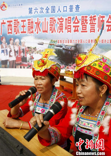 10月24日,广西歌王在融水苗族自治县宣传人口普查。当天,18名广西四星级山歌王应融水苗族自治县人口普查办邀请汇聚融水芦笙广场,轮番用山歌演唱人口普查相关知识,吸引大批民众前往观看。