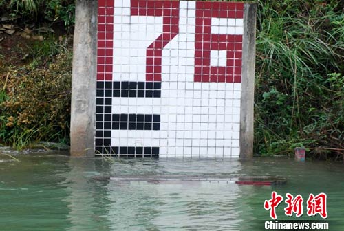 10月25日下午15时,三峡重庆库区水域巫山梅核子蓄水尺显示,江水已淹没175米刻度红线。据长江重庆航道局工作人员解释,尽管目前三峡大坝坝前水位未到175米,但因三峡库区是一座长约660公里的狭长水库,受两岸山体的阻滞,库区上下游会形成一定的水位落差。 中新社发 银雪 摄
