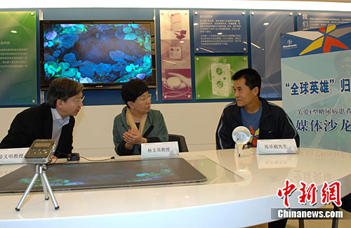 中国糖尿病专家、解放军总医院内分泌科主任母义明(左1),中日友好医院内分泌科主任杨文英(中)与已有20多年1型糖尿病史的张乐庭(右)了解他参加“美敦力双子城马拉松赛”时的血糖控制情况。张乐庭今年10月入选美敦力“全球英雄”活动,作为唯一的中国选手赴美国参加“美敦力双子城马拉松赛”,在7000多参赛中获得前650名的好成绩。喜爱长跑运动的张乐庭1999年开始使用美敦力胰岛素泵控制血糖,减少了血糖波动和低血糖的风险,体重从原来的45公斤恢复到65公斤,保证了他常年的长跑锻炼,并多次在国际马拉松比赛中获得名次。中新社记者 曾利明 摄