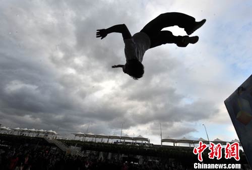 10月26日,寒潮来袭上海,原始人精英极限俱乐部的小伙子冒着五级寒风在世博园表演技艺。 中新社记者 贾国荣 摄