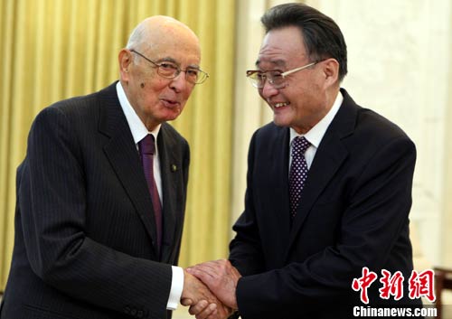 10月27日下午,中国全国人大常委会委员长吴邦国在北京人民大会堂会见意大利总统乔治·纳波利塔诺。中新社记者 任晨鸣 摄