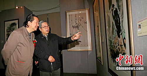 中国国家画院院长、中国美术家协会副主席杨晓阳(左)在中国友联画院常务副院长李荣海(右)的陪同下参观画展。王保胜 摄