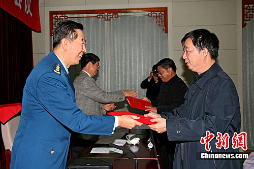 中国友联画院名誉院长刘振起、中国友联画院艺委会主任刘大为、中国友联画院院长邢运明为受聘于中国友联画院的书画家颁发聘书。王保胜 摄