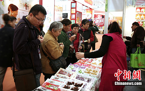 10月28日,鲁台经贸文化交流周2010山东(台湾)名品博览会在济南国际会展中心开幕。此次活动将设台湾精品形象区、服饰及配件区、节能减排及科技产品区、农产食品区、文化创意区等9大展区,参会观众人数预计将超过30万人次。图为泉城市民前来参观并品尝台湾小吃。中新社记者 邱江波 摄