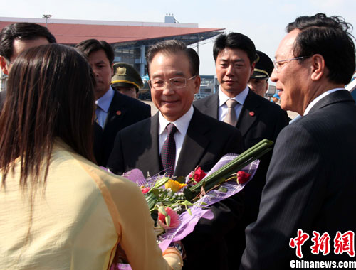 中国总理温家宝当地时间28日下午2时许乘专机抵达越南首都河内,出席东亚系列峰会。越方代表和中国驻越南使馆官员等到机场迎接。中国和越南女青年向温总理献上鲜花。