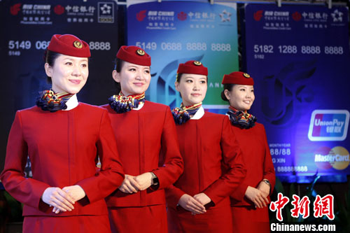 10月28日,中信国航知音世界信用卡首发新闻发布会在北京举行。据悉,中信国航知音信用卡的服务体系本月将全面升级,经过本次升级,原“普卡、金卡、白金卡”三级服务体系将升级为“普卡、金卡、钛金卡、白金卡、世界卡”五级服务体系。图为空姐助阵首发仪式。