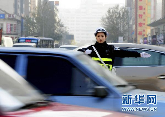 10月28日,沈阳公安交警和平一大队的女交警雷晓帆在市区岗位上执勤。张文魁 摄
