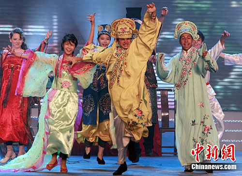 10月28日晚,第三届“汉语桥”世界中学生中文比赛在重庆落幕,新加坡代表队过五关斩六将,最终获得团体一等奖,摘得桂冠。图为外国中学生在闭幕式上演出另类《梁祝》。中新社发 孟幻 摄