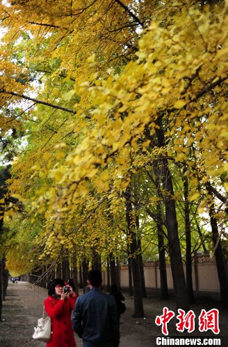 10月31日下午,一些市民在北京钓鱼台国宾馆附近的银杏林里拍照留念。随着天气转凉,北京市内的街道树木也换上了“秋冬装”,展现另一番美景。
