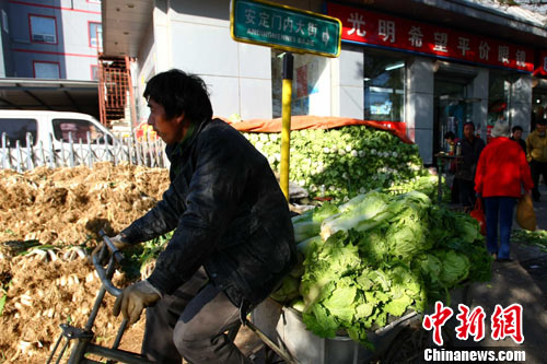 11月1日,北京冬储大白菜开卖。由于今年中国各地的大白菜种植面积大幅缩水,冬储大白菜的价格也创下了历史新高。中新社记者 富田 摄