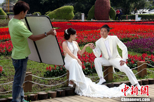 图为当天幸运入围的新人纷纷按照介绍抢点最热门的“花海”景观,尽情享受花间婚纱乐趣。中新社记者 王健 摄