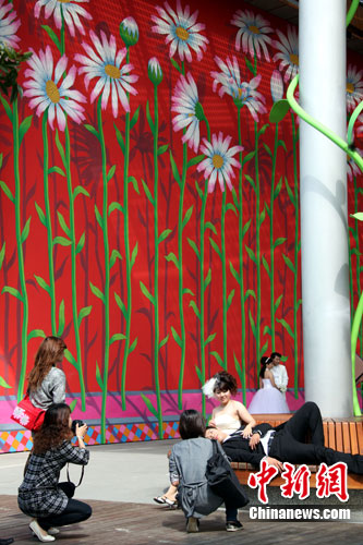 图为当天的拍摄中,花博园梦想馆外厅根据台湾著名漫画家几米画作而打造的特色彩绘墙,其魅力毫不输与园内五彩斑斓的花海实景,成为婚纱新人的宠爱景点。 中新社记者 王健 摄