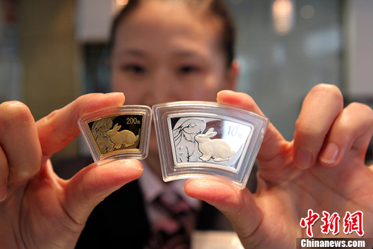 11月1日,河南郑州,2011中国辛卯(兔)年金银纪念币在河南省钱币公司经三路店亮相。中新社发 王中举 摄