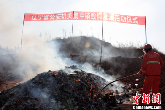 辽宁省警方11月2日发布消息称,全省从1月份开展打击假发票犯罪专项行动以来,共破获各类假发票犯罪案件138起,抓获犯罪嫌疑人248名,打掉犯罪团伙29个,捣毁大型印制窝点7个,小型印制窝点13个,储藏、信息窝点77个,抓获行动前网上逃犯7名,假发票涉及金额高达千万亿,并于当日将收缴的假发票全部销毁。中新社发 秦逸 摄