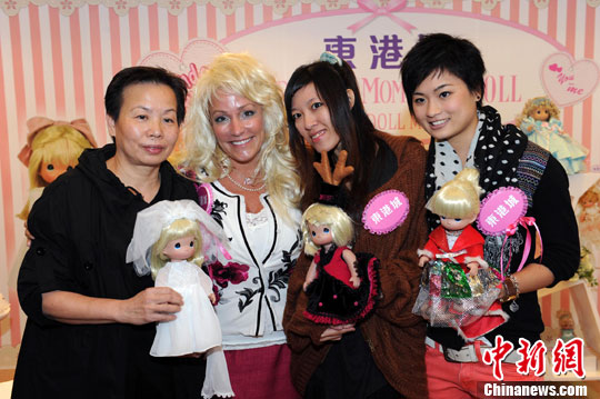 11月2日,亚洲首个大型瓷娃娃展览“Precious Moments珍爱圣诞”将于本月中旬起在香港东港城举行。在美国主理多种畅销品牌有“洋娃娃女皇”盛誉的Linda Rick,首度应邀来港出席Precious Moments展览及设计大赛新闻会并与部分参赛者合影。中新社发 郑祚声 摄