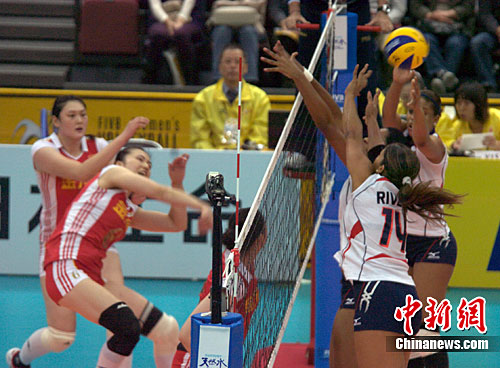 11月2日晚,2010女排世锦赛中国队小组赛第四场迎战南美劲旅多米尼加队。背负着不胜则淘汰的重压,中国队以3:0力克对手,从而挺进16强。中新社发 孙冉 摄