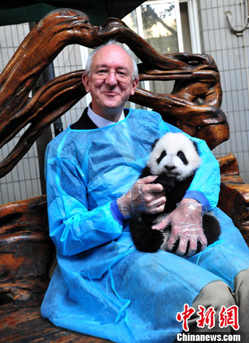 11月3日上午,世界知名的剑桥大学出版社,捐资50万元人民币,在成都大熊猫繁育研究基地终生认养了一只大熊猫,并取名为“剑桥”。图为剑桥大学出版社全球首席执行官潘仕勋先生与大熊猫亲密接触。