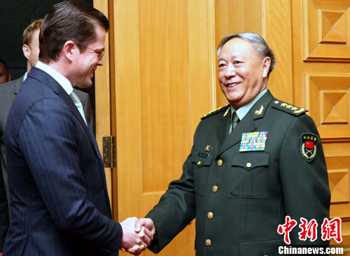 11月3日上午,中国人民解放军总参谋长陈炳德上将,在北京八一大楼会见来华访问的德国国防部长古藤贝格一行。中新社记者 宋吉河 摄