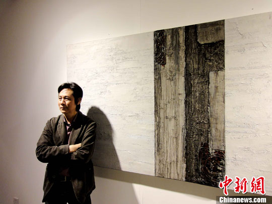 中国美术家协会会员、中国版画家协会理事、深圳大学教授应天齐《遗痕》系列作品近日在深圳华侨城文化创意产业园艺术中心展出,其作品视觉张力强、绘画风格独特、选材用材奇异,令人耳目一新,在艺术界引起共鸣。中新社发 陈文 摄