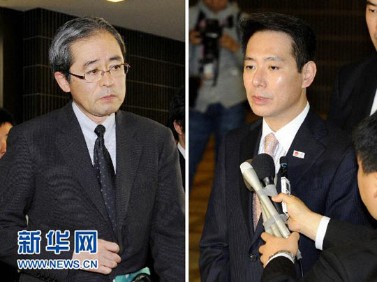 11月3日拍摄的拼版照片显示:日本驻俄罗斯大使河野雅治在东京向日外相前原诚司汇报完后走出日本外务省(左)和日本外相前原诚司接受记者采访(右)。