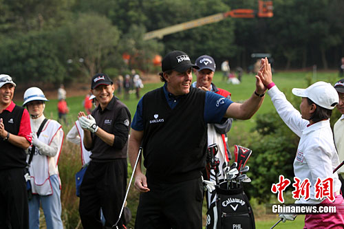11月3日,世界级高尔夫大师菲尔·米克尔森在上海与小球员“切磋球技”,引来无数球迷前来一睹高尔夫巨星的风采。菲尔-米克尔森、“老虎”伍兹将参加于4日开始的2010高尔夫世锦赛——汇丰冠军赛。中新社记者 汤彦俊 摄