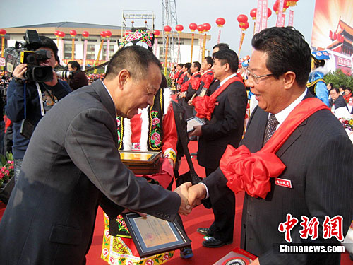 图为北川向援建人员赠送荣誉市民证书和援建纪念章。中新社发 杨超 摄