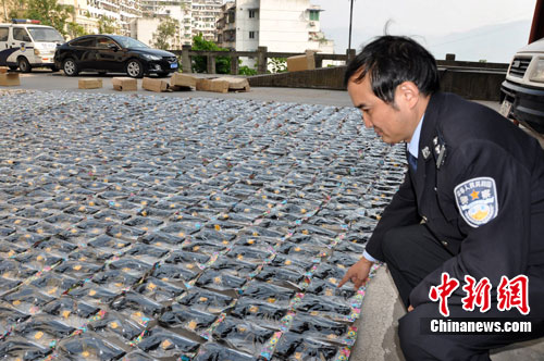 11月4日,重庆云阳县警方通报,该县民警捣毁了一个批发销售仿真枪的窝点,共缴获仿真枪2830支、子弹100.5万粒、摔炮11.5万响、火皮26万响、管制刀具2把。警方称,这批仿真枪的威力较大,如果对准他人射击,极易致人伤亡。目前,仿真枪销售者已被拘留。图为部分被警方收缴的仿真枪。中新社发 刘兴敏 摄