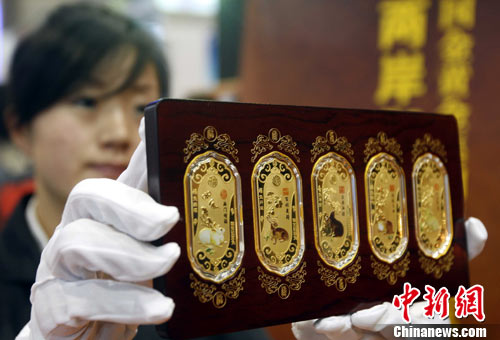 11月4日,在北京举行的国际金融展上,国金黄金首发《国宝团圆兔》金/银砖。该藏品为北京、台北两岸故宫馆藏御兔图,首次聚首贺岁,寓意两岸早日团圆。中新社记者 张宇 摄