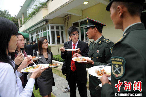 中国人民解放军驻港部队与香港大学学生交流日,4日在香港大学举行。图为部队官兵与同學在午餐会上交流。