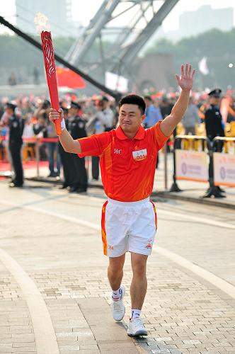 火炬手黄力平手举火炬健步领跑圣火传递。梁旭 摄